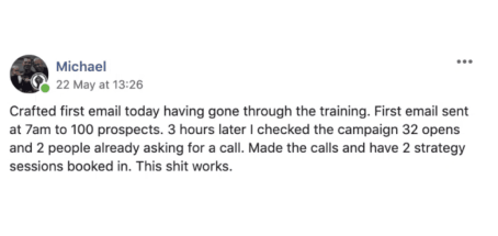 Michael reached out to 100 business owners with our offer structure. This was his FIRST ATTEMPT and FIRST EMAIL. Within 3 hours he has 2 calls booked and SHOW, which turn into full strategy sessions.
