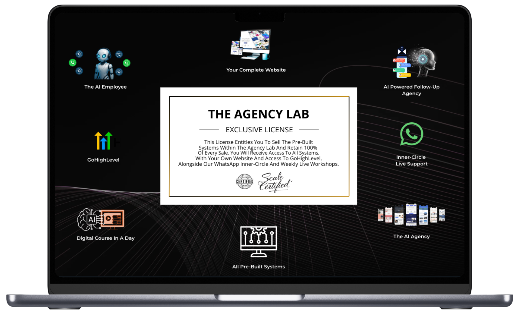 You get access to our high-demand AI services including AI Employees, AI Voice Agents, AI Websites & Funnels, Database Reactivation, and Digital Course Creation. These are services business owners are already actively buying—the license lets you sell them immediately.